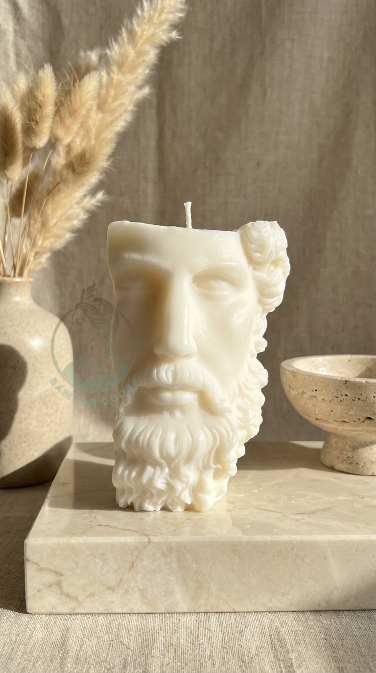 Анфас громовержца Зевса. Данная портретная форма словно после раскопок в Древнем Акрополе - случайный скол некогда великой скульптуры. Прекрасно будет смотреться у книг, на рабочем столе, на полке с другими античными элементами декора. А может, легендарное божество словно выглядывает из-за кашпо с орхидеями...